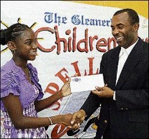 Left: Khadejah Stewart collects a trophy from Gleaner Deputy Managing Director Christopher Barnes during yesterday's Gleaner Children's Own Spelling Bee Scholarship winners presentation at the newspaper's North Street, central Kingston, offices. Right: Samantha Rhule receives a cheque from Rudolph Speid, Gleaner Group financial controller. - photos by Ricardo Makyn/Staff Photographer