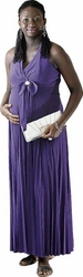 A pregnant woman can hold her own in this purple halter dress with long dangling earrings, a nice bracelet and a complementary clutch.