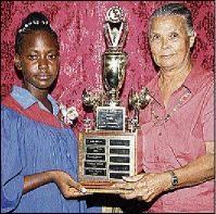 Maizan Robinson receives a trophy from Florence Haye, a community advocate, for being the female student with the highest GSAT scores at Barbary Hall Primary School. She also received $10,000 from the MP.
