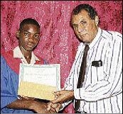 Derrick Sangster, councillor for the Mountainside division in St Elizabeth, presents a cheque valued at $25,000 and a certificate to top male student Omroy Simms. The awards were donated by Agriculture Minister and Member of Parliament for North West St Elizabeth, Dr Christopher Tufton.