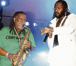 Tarrus Riley keeps time on his watch to see how long saxophonist Dean Frazer could blow his instrument. Riley's act outclassed several others for that night. - Photos by Noel Thompson