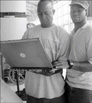 Left: Andrea Hunter (right) engages in a reading exercise with her daughter, Tashicka Comrie. Right:Michael Blair (left) and Michail surf the Internet, an activity they both enjoy. - Photos by Nadisha Hunter