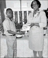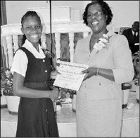 Left: Daniella Bromfield collects a certificate from Mavis Rowe after she emerged the female student with the highest GSAT score at New Hope Primary and Junior High School's graduation ceremony at the Whitehouse Church of God of Prophecy on June 30. Right: Andrew Hyman accepts a certificate from Mavis Rowe for being the male student with the highest GSAT scores.