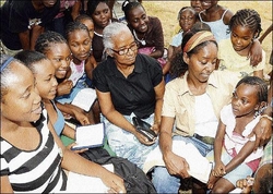 Marva Atkinson (centre) and her daughter, Nadine (wearing headscarf), surrounded by some of the children who attend their summer school. - photos by Norman Grindley/Chief Photographer