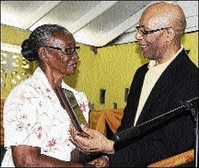 Sir Patrick Allen presents a plaque to his favourite teacher, Fredricka Murdock-McKenzie, who taught him when he attended Fruitful Vale All-Age School. - Contributed