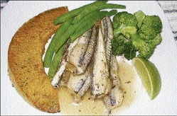 Fresh grilled sardines served with a white wine sauce, blanched string beans and broccoli, and baked pumpkin. - Barbara Ellington/Lifestyle Editor