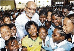 Douglas Orane (centre), chairman and chief executive officer of GraceKennedy Ltd, and Shelly-Ann Fraser, Olympic and World 100m champion, are greeted by students of Wolmer's Girls' School during a ceremony to honour Fraser at the school yesterday. The two also had a surprise for Fraser's almer mater. - Rudolph Brown/ Photographer