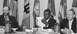 Prime Minister Bruce Golding (right) chairs a meeting of CARICOM's prime ministerial subcommittee on external negotiations at the secretariat in Georgetown, Guyana, earlier this year. The meeting addressed the implementation of the Cariforum-EU Economic Partnership Agreement, developments related to bananas, and the preparations for commencement of the Caricom-Canada negotiations for a trade and development agreement. From left is Ambassador Erwin LaRozque, Caricom assistant secretary general for trade and economic integration, and Edwin Carrington, Caricom secretary general. - Contributed