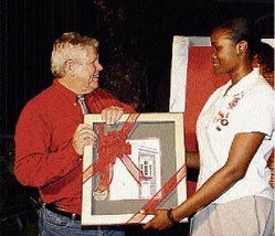 Campion head girl Sharlayne Waller presents Gordon 'Butch' Stewart with an architect's design of the proposed new main library at the launch of the Vision 2020 Campaign at Campion College on Wednesday. - Colin Hamilton/freelance photographer