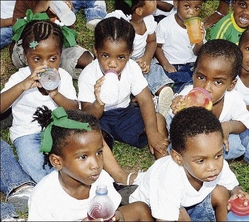 Students from Mom's Love Early Childhood Development Centre in St Andrew have a cool drink after a tour of the National Heroes Park in Kingston yesterday.