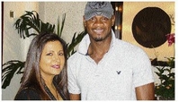 Sheila Benjamin McNeill smiles for Something Extra with track star Asafa Powell on Wednesday when the Guardsman Group hosted several athletes at lunch and presented them with memberships to Gymkhana. - Contributed