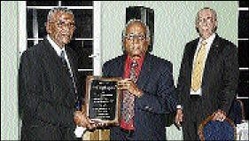 Dr Suresh Persad (centre) presents Professor Hugh Wynter (left) with a plaque in honour of his teaching and services to the University of the West Indies. Sharing in the occasion is Professor Henry Fraser, dean of the medical school in Barbados, during...