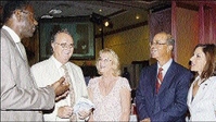 Emile Spence (left) of Jamaica National Building Society grabs the attention of director of the Jamaica Cancer Society, Lawrence Stewart, with his wife, Elin; vice-chairman of the Jamaica Cancer Society, Michael Fraser; and Tara Nunes of Pan Caribbean in a discussion.