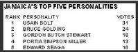 Eighty persons classified by the writer as opinion leaders and highly placed persons were asked to name their choices for the top five personalities in Jamaica.