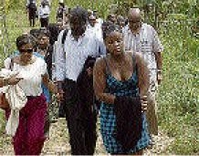 left: Chargé d'affaires of the US Embassy, Isiah Parnell (second left), walks hand in hand with his wife, Tammie (left) and daughter, Taylor (in foreground), with other officials from the United States Agency for International Development and the Tourism Ministry, walk along one of the paths, which form part of the Flagstaff Maroon Village Heritage Tour and Trail.