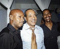 Michael Lee-Chin (centre) welcomes Asafa Powell (left) to the party. Looking on is Bruce James, manager of MVP Track Club.