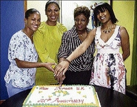 From left: Dr Kurdell Espinoza (former Miss Jamaica UK), June Daley, president of the pageant; Culture, Youth & Sports Minister Olivia Grange, and Erica Myers-Davis, author and pageant committee member, cut the cake to celebrate the pageant's 20th anniversary at the minister's office last Thursday. - Contributed
