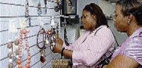 Face Forward's director Sharon Wint (right), tests a shade on customer, Andrea Smith at the opening of her store, located at Shop #19A, Orchid Village Plaza, 20 Barbican Road. - Winston Sill / Freelance Photographer