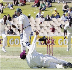 The Caribbean side had some quick redemption in the following over, celebrating the dismissal of the accomplished Ponting (20), bowled by pacer Ravi Rampaul off the inside edge as the Australian skipper tried a forcing cut shot.