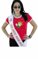 Rebecca Silvera, Miss Jamaica Tourism Queen 2009, shows her 'backative' in a T-shirt representing One Touch Charity Limited.