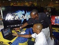 Brandt Fuller (seated), web development man-ager, looks at a website with Joel Jones, business development manager, at the YEA expo.