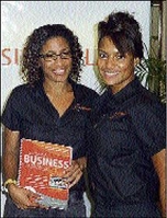 Kimala Bennett (left), managing director of Business Lab, shows off her business manual while Sherilyn McLean, business information consultant, smiles for the camera.