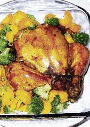 (5) Pre-heat oven to 14oC and place chicken in a Pyrex dish or roasting pan with breast up.