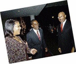 Chief Justice Zaila McCalla (left) and Court of Appeal President Justice Seymour Panton (second left) catch up with Governor General Sir Patrick Allen at the Supreme Court Judges' Annual Dinner, held at the Jamaica Pegasus Hotel, New Kingston on Saturday, December 19.