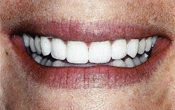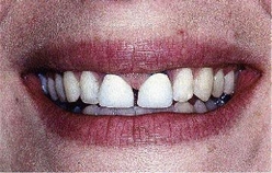 Left: Before cosmetic dentistry. Right: The results after veneers have been added, fixing all the flaws of the front teeth and closing of the gap.