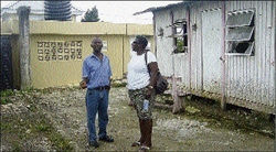Maas Roy in conversation with Lorlett Hudson, visiting from England. Behind her is the dilapidated health centre in Jeffrey Town. To Maas Roy's left is the new centre whose construction he coordinated through the Jeffrey Town Farmers' Cooperative.