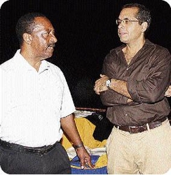 Air Tran Airways Destination Manager Neville Malcolm (left) and Stephen Dear, former bank executive, on-board the Reggae Baby II during the Monday Club's recent cruise.