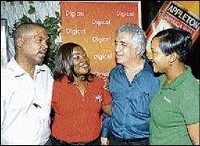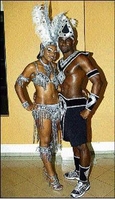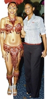 Left: Jhnnell Eastman shows off the Digicel-sponsored Bacchanal Jamaica 2010 costume as Digicel's Tracy-Ann Thelwell gets a photo opportunity. Right: