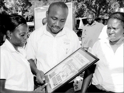 Jamaica Urban Transit Company (JUTC) bus driver Annette Howard (left) admires a photograph of herself at the recent American Airlines jet wreckage, while her colleagues Roger Jones and Yvette Mitchell look on.