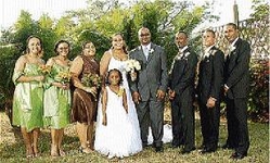 The bride and groom, Natalee and Amilcar Bennett, are sandwiched by (from left) bridesmaids, Rachel Ralph and Roxanne Bennett; maid of honour, Melanie Ffrench; best man, Paul Harris; groomsmen, Robert Ffrench and Roget Walters; and in front is flower girl, Gabrielle Davis. - photos by Ricardo Makyn/Staff Photographer