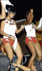 Left: The Appleton Girls entertained the crowd. Right: These three women paused from the partying to pose for photos at Bacchanal Jamaica Friday night Carnival Lyme, held at the Mas Camp, Oxford Road, New Kingston, on Friday. - photos by Winston Sill/Freelance Photographer