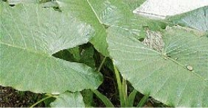 For those of us interested in the ornamental value of this plant, the common name, 'elephant ears', is apt, since we are impressed with the size of the heart-shaped leaves. But those with a culinary bent think of the plant as 'taro' or 'coco yam', in which case the focus is usually on the corm (i.e., a 'root').