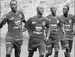 Bridgeport's Adoah Nickle (left) celebrates his opening goal with teammates Tyrone Thompson (second left), Shamari Shaw (second right) and Janiel Hardware in their Manning Cup match against Wolmer's at Constant Spring yesterday. Bridgeport won 3-1. - Ricardo Makyn/Staff Photographer